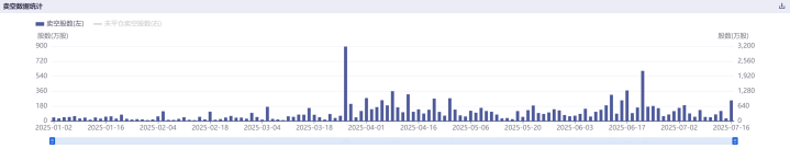 然而,与这份亮眼业绩形成鲜明对比的,是市场以真金白银投出谨慎票。泡泡玛特在发布预喜公告后的首个交易日(7月16日),其卖空股数激增至249.56万股,较前一交易日(7月15日)的34.20万股飙升逾6倍,创下自6月20日以来的新高。